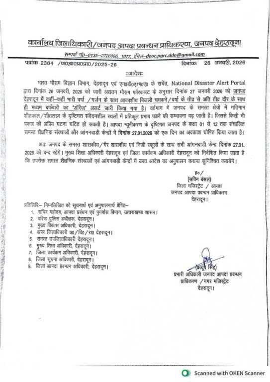 भारत मौसम विज्ञान विभाग, देहरादून एवं एन०डी०एम०ए० के सचेत, National Disaster Alert Portal द्वारा दिनांक 26 जनवरी, 2026 को जारी अद्यतन मौसम फॉरकास्ट के अनुसार दिनांक 27 जनवरी 2026 को जनपद देहरादून में कहीं-कहीं भारी वर्षा / गर्जन के साथ आकाशीय बिजली चमकने / वर्षा के तीव्र से अति तीव्र दौर के साथ ही मध्यम बर्फबारी का ‘ऑरेंज’ अलर्ट जारी किया गया है। वर्तमान में जनपद के समस्त क्षेत्रों में गतिमान शीतकाल / शीतलहर के दृष्टिगत संवेदनशील स्थलों में प्रतिकूल प्रभाव पडने की सम्भावना बढ़ जाती है। जिससे किसी भी प्रकार की अप्रिय घटना घटित हो सकती है। आपदा न्यूनीकरण के दृष्टिगत जनपद के कक्षा 01 से 12 तक संचालित समस्त शैक्षणिक संस्थाओं और आंगनबाडी केन्द्रों में दिनांक 27.01.2026 को एक दिन का अवकाश घोषित किया जाता है।