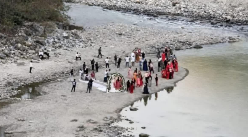 अल्मोड़ा: उत्तराखंड में वेडिंग डेस्टिनेशन हब बनाने के लिए राज्य सरकार जुटी है, वहीं सल्ट के मर्चूला में एक विवाह समारोह का स्थल विवाद का कारण बन गया. यहां रामगंगा और बदनगढ़ नदी के संगम के पास स्थित एक पुराने अंत्येष्टि स्थल पर जयमाला की रस्म निभाई गई, जिसका वीडियो सोशल मीडिया पर वायरल होने के बाद विवाद गहरा गया है. तहसीलदार आबिद अली ने कहा कि रिजॉर्ट संचालक से पूछताछ कर कार्रवाई की जाएगी. श्मशान घाट में इस तरह की गतिविधि को उन्होंने भी गंभीर माना है.